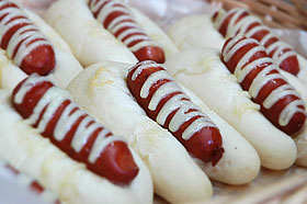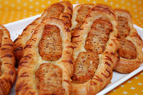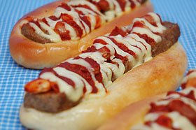 ペッパー、赤唐辛子、にんにくなど香辛料たっぷりの小粒のウインナーを白パン生地にのせました。