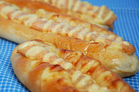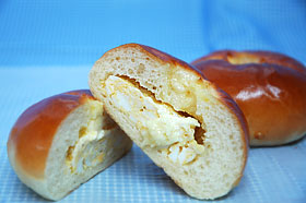 中はとろっとカマンベールチーズ、ふわふわの白パンに包み表面にはエダムチーズをふりかけカリッカリに。